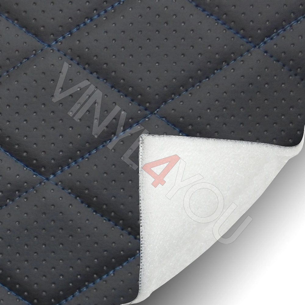 Экокожа стеганая перфорированная Ромб Черная с Синей строчкой